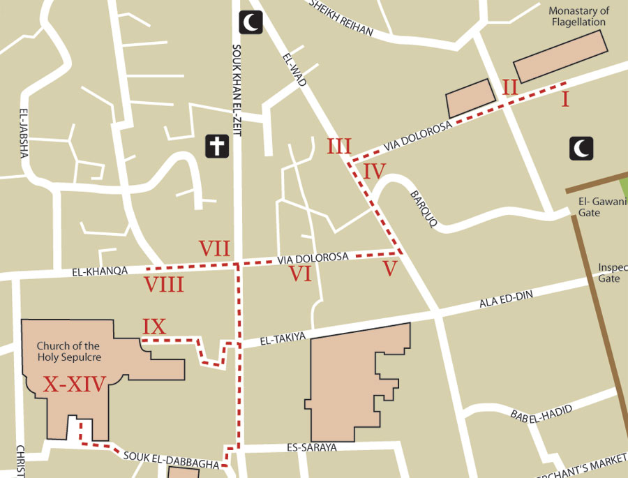 In the Holy Land I also learned that Christian tradition not only preserves details about Jesus’ Passion (such as his three falls and St. Veronica’s veil) but also commemorates the locations at which these sad moments occurred. These fourteen Stations of the Cross are still venerated and prayerfully walked by pilgrims in Jerusalem today. It is a powerful, beautiful experience which I wanted to recreate in the streets of my community, and which you might wish to offer yours.