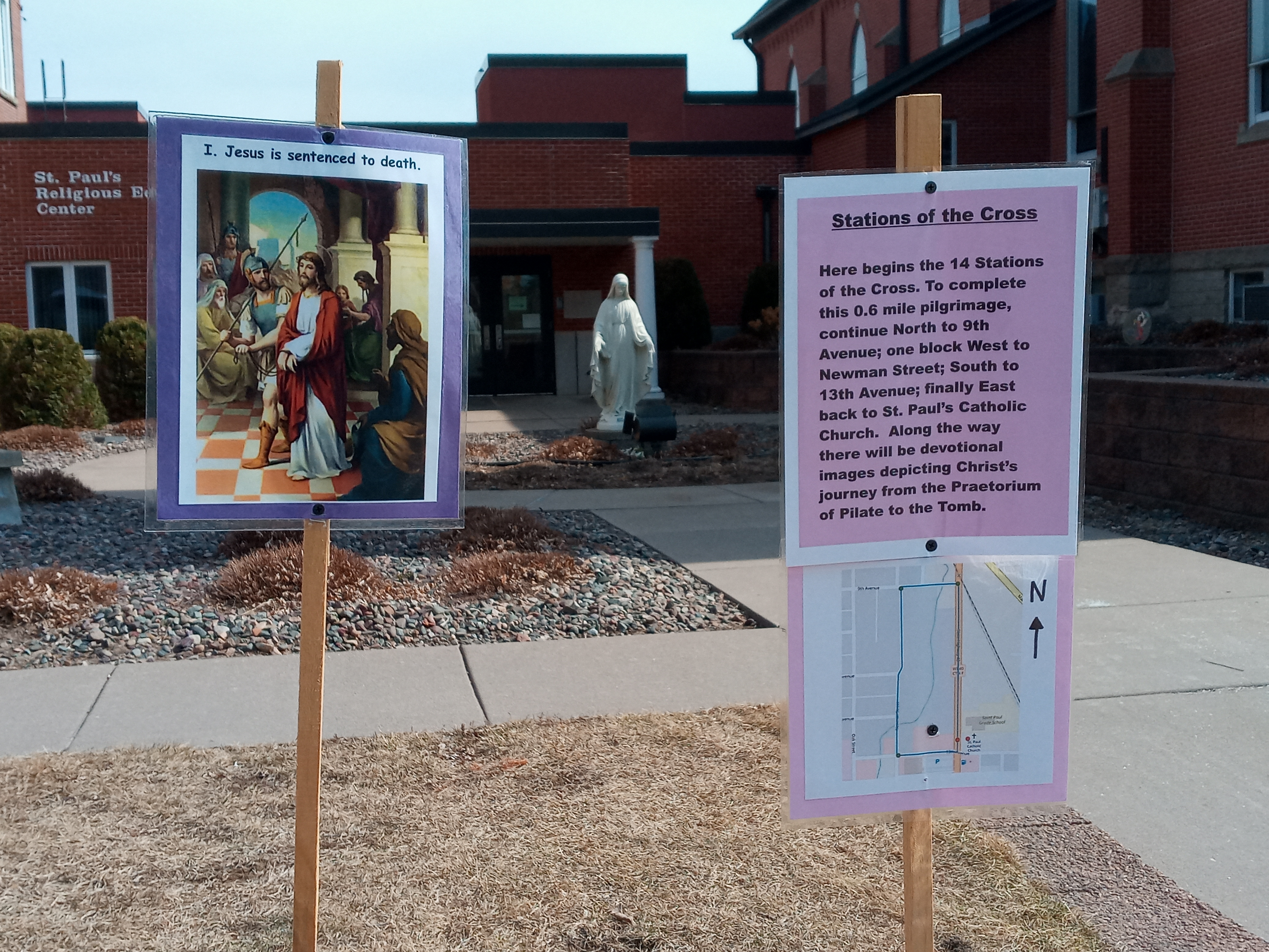 This Lent, we’ve created an outdoor Way of the Cross. It begins in front of our church and school and loops one time around the city block opposite them. After measuring maps and receiving permission from the various landowners, we posted the traditional fourteen Stations along a path which approximates the actual Way of the Cross, both in its length and its distances between the Stations. Walking it takes about twelve minutes (if one does not pause to pray) and we plan to keep the Stations up until Easter Sunday. Our small-town, local newspaper even ran a story about them.