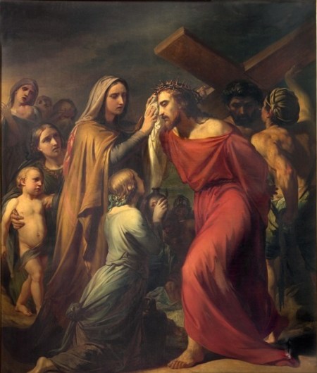 “As a woman, she could not physically carry the Cross or even be called upon to do so, yet in fact she did carry the Cross with Jesus: she carried it in the only way possible to her at the moment and in obedience to the dictates of her heart: she wiped his Face.”