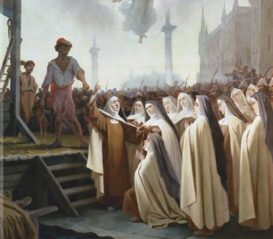 In the midst of the French Revolution, a community of Carmelite nuns in Compiègne felt moved to make an offering themselves to God as a sacrifice for their troubled nation and the Catholic Church in France. Almost two years later, after the state had closed and seized all the convents and outlawed the wearing of habits, the sisters were found, arrested, and condemned to death. On July 17th, 1794, sixteen chanting nuns ascended the scaffold one-by-one and were guillotined before a silenced crowd. Ten days after the Blessed Martyrs of Compiègne’s sacrifice the evil “Reign of Terror” ended.